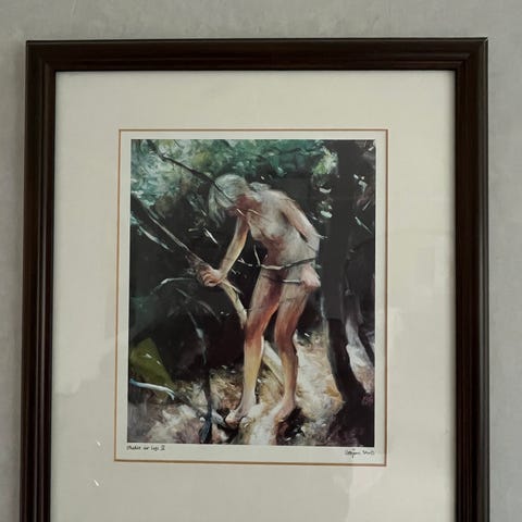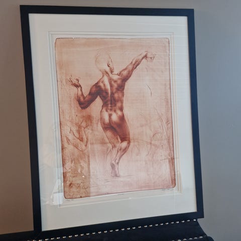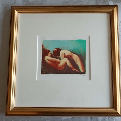 To nakne menneskefigurer i en dynamisk positur. Bildet er innrammet med en gyllen ramme og har en bakside med opphengstråd for veggmontering.