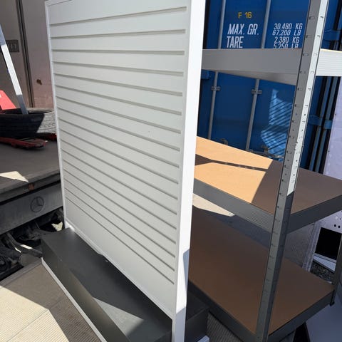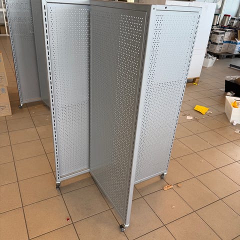 Metall perforerte frontpanelet med ben. Panelet har kvadratiske hull for fleksibel montering av kroker og holdere. Målene på selve platene er 166cm høy, kr9 cm bred og 3 cm tykk. Støttende ben gir stabilitet og enkel plassering på gulv. Egnet for utstilling. verksted, garasje eller arbeidsområde. Selger totalt 22 stk. kr 750,- pr stk Ved samlet kjøp kan prisen diskuteres