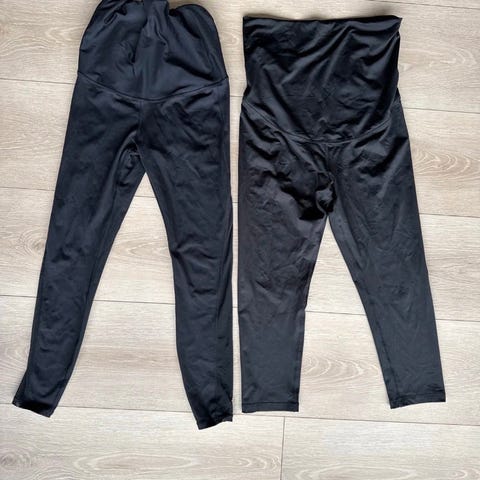 Gravidklær. En tights fra Hm og en joggebukse. Begge deler er godt brukt, men mye bruk igjen. Begynner å nærme seg hull i sømmen mellom beina, men kan syes av de som kan sånt :)
