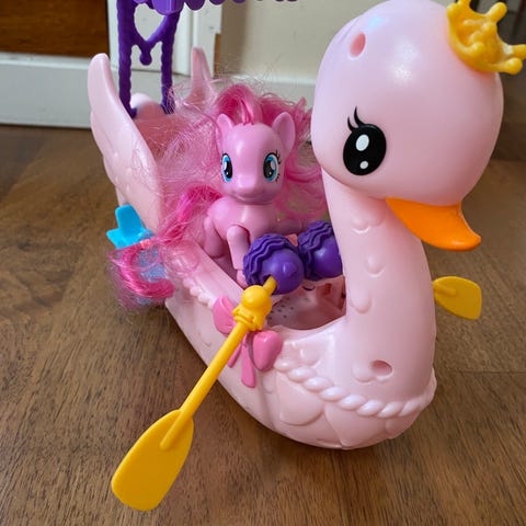 My Little Pony : Rainbow Dash og havfruehest. Begge er interative. Rainbow Dash snurrer rundt på vognen din når vognen triller. Havfruen spiller musikk når man trykker på en knapp. Veldig pent brukt.