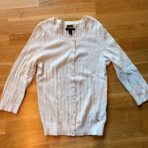 Banana Republic cardigan i størrelse S for dame, laget av bomull. Cardiganen har en grå farge og knappelukking foran, med lommer på forsiden. Materialblanding inkluderer 93 % bomull og 3 % metallisk fiber. Ermer 3/4.