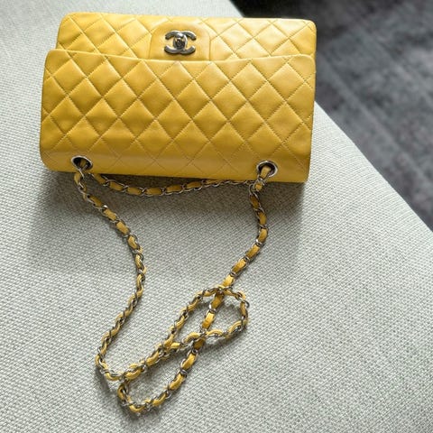 Dette er en CHANEL Shiny Calfskin Quilted Small Coco Chain Gold Handle Flap. Vesken er laget av diamantquiltet kalveskinn i svart.