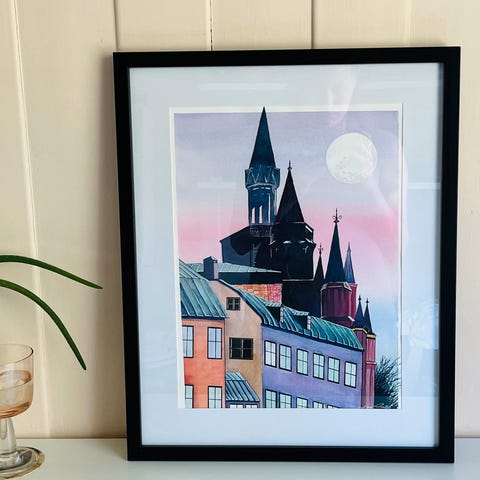 Ukjent merke Akvarell maleri som viser et bylandskap med bygninger, tak og et tre. Maleriet er festet på en pappbakgrunn med synlige tegn på aldring og slitasje. Fargene domineres av jordtoner og blå himmel. Akvarel datert året 32 og har maler sin underskrift på pappbakgrund