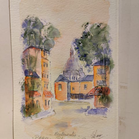 Ukjent merke Akvarell maleri som viser et bylandskap med bygninger, tak og et tre. Maleriet er festet på en pappbakgrunn med synlige tegn på aldring og slitasje. Fargene domineres av jordtoner og blå himmel. Akvarel datert året 1932 og har maler sin underskrift på pappbakgrund