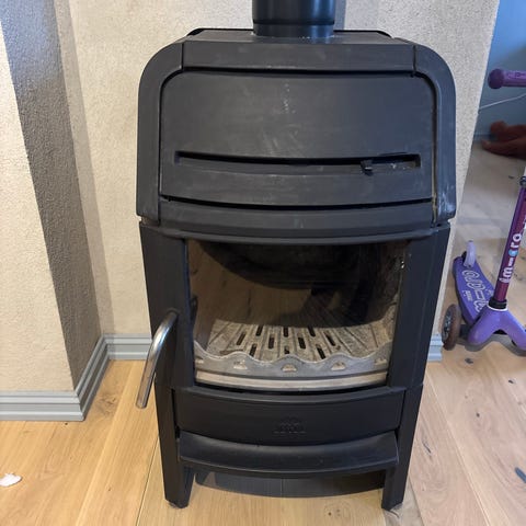 Pelletskamin i svart farge. Egnet for oppvarming av rom. Materiale og størrelse er ikke oppgitt.