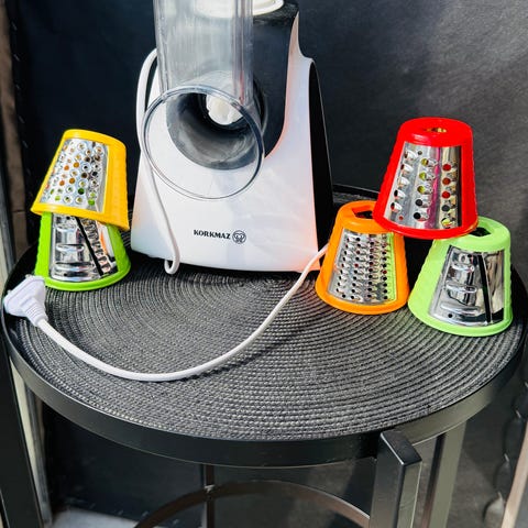 Multikvern, rivjern og grønnsaksskjærer med flere utskiftbare tromler i forskjellige farger for ulike skjærefunksjoner. En kjøkkenmaskin som passer til bruk for effektiv matberedning.