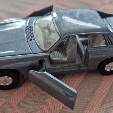 Lagonda LG 6 modellbil med svart interiør. Modellen har detaljer som åpen takløsning og klassisk design.