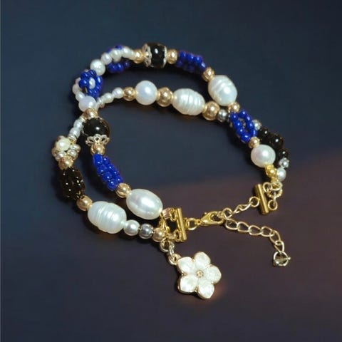 Et håndlaget/design Armbånd satt sammen av kun allergivennlige matrialer som Hvite natur perler små i risform, eller større ferskvanns perler. Lilla drømmende Amethyst natur steins gem krystall, detaljer av gull og sølv, rudtfritt stål. Passer Vinterstiden i looken, og går til det meste som et vakkert tilskudd. Armbåndet kan reguleres i lengden. Og smykkelåsen har en ekstra lengde hale av hvite natur perler, sølv gull og Amethyst krystall.