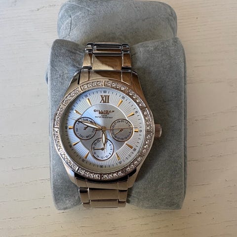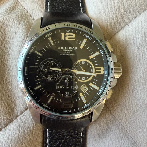 Pen Dilligaf klokke med stål lenke og svart urskive. Klokken har flere funksjonsvisere og et klassisk design. Egnet for daglig bruk og formelle anledninger.