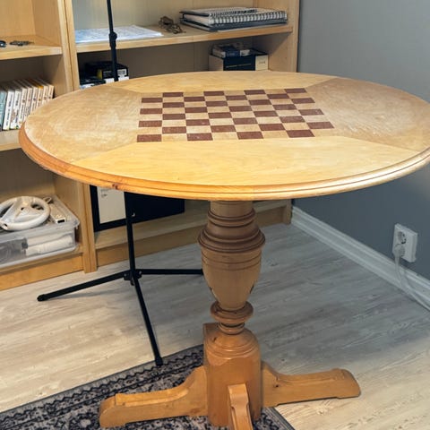 Karakterfullt sjakkbord i mørkbeiset treverk med to tilhørende stoler.