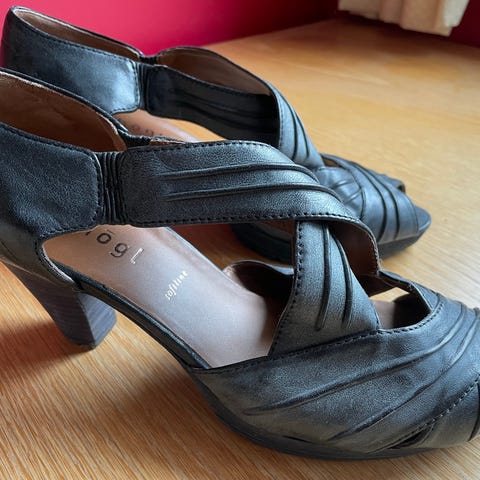Högl softline pensko i størrelse 39, grønn farge. Laget i nubuk skinn med ankelrem og spenne. Skoene har en 5 cm høy hæl og veldig gode å gå i. Skinnet er helt og pent, litt slitasjemerker bak på hælene som sikkert kan pusses bort