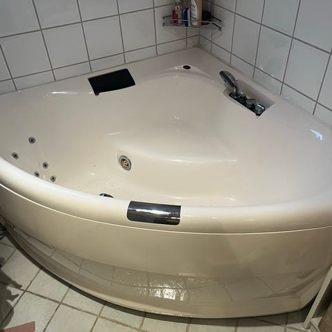 Hjørnebadekar i hvit akryl med innebygd armatur og avløpsslange. Badekaret er formet for hjørneinstallasjon og har en rundet design. Vi har erstattet det med et annet, men det har vært i bruk til nettopp. Bredde 140cm. Opprinnelig fra 2006