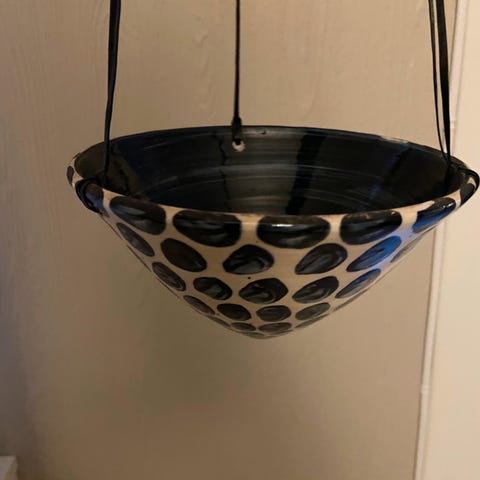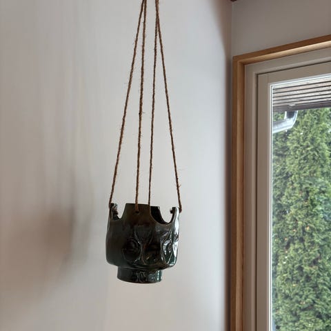 Grønn, mønstret blomsterampel . Mest sannsynlig terrakotta. 17 cm i diameter og ca 17 cm høy.