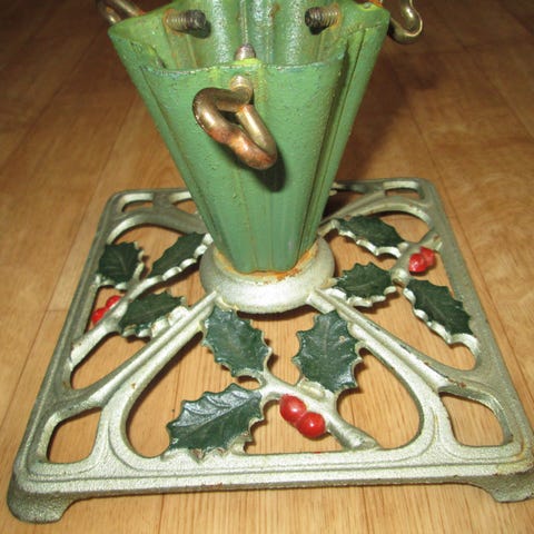 Juletrefot laga i støpejern med dekorative blomster- og bærdetaljar. Har justerbare skruar for å halde juletreet stabilt. Foten har ein firkanta base med blomsterdesign og er malt i fargane grønn, rød og gull. Mål 18cm x 18cm. Diameter oppe er 6 cm på det smalaste, og 8cm på det breiaste. Høgda er ca. 12cm