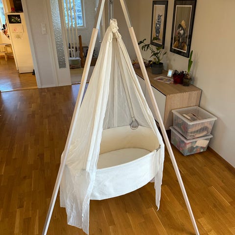 Kjempefin vugge fra Monte Rockwell, svært pent brukt. Medfølger vanntettmadrass og laken fra Stokke.