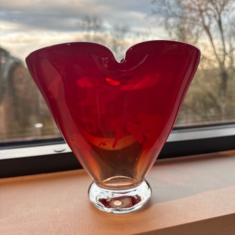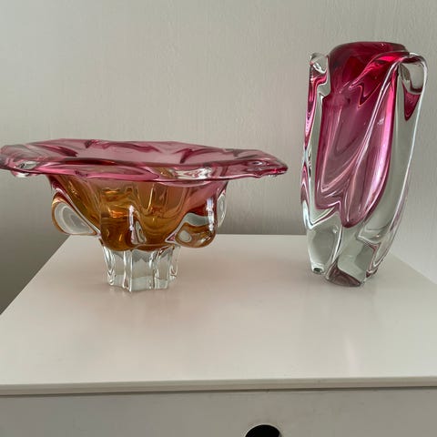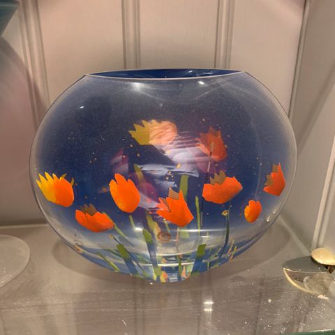 Sjeldent og vakkert Ari Behn-sett: stor hjertevase og matchende fat. Dette er et nummerert og begrenset opplag (32/300). Vasen er signert og har inskripsjon foran : « Hver dag er en fest». Bak: «Du er et smykke»