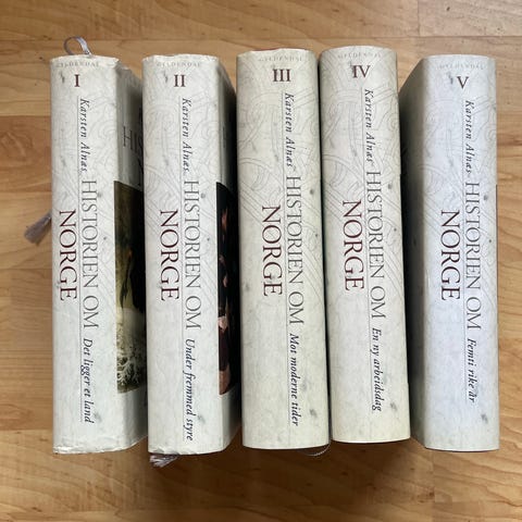 Karsten Alnæs Historien om Norge bokserie bestående av 5 bind (komplett). Serien dekker norsk historie fra ulike perioder, inkludert 'Det ligger et land', 'Under fremmed styre', og 'Mot moderne tider'. Bøkene inneholder illustrasjoner og tekst som beskriver historiske hendelser i Norge.