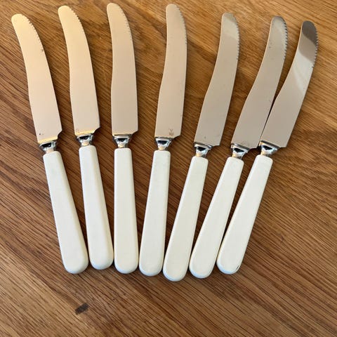 9 retro kniver i rustfritt stål med hvitt skaft.