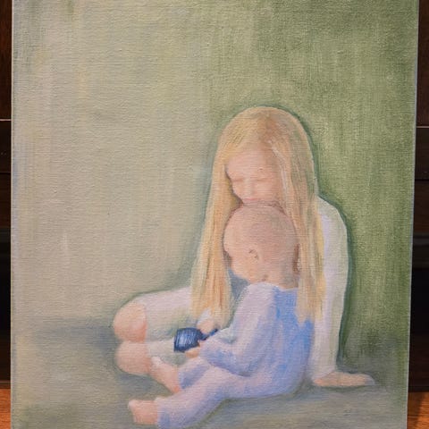 Bilde er selvlaget med tusj på lerret, og er i størrelsen 18 cm i lengde, og 12 cm i bredde. Kr 100.