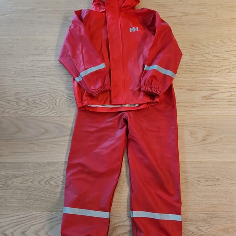 Helly Hansen regndress / regnsett bestående av jakke med glidelås og bukser med seler. Reflekser på ermer og bein. Pent og veldig lite brukt før det ble for smått.