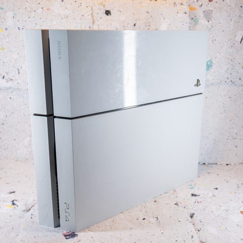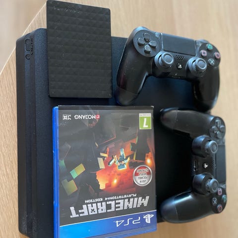 PlayStation 4 konsoll med to trådløse kontrollere, en i svart og en i gull.