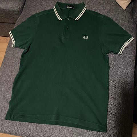 Selger en original Fred Perry poloskjorte i navy blå farge med lyseblå og hvite striper på krage og ermer. Skjorten har den klassiske laurbær-logoen brodert på venstre bryst og metallknapp med Fred Perry-gravering.
