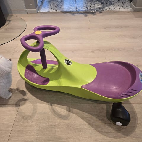 Ole brum lekebil. Kommer med brett som gjør at den gynger. De grønne støttene på siden og håndtaket bak kan tas av.