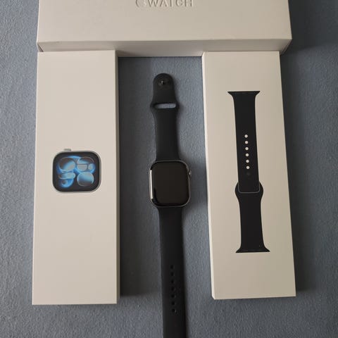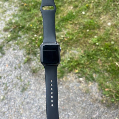 Selger en pent brukt Apple Watch Series 4 (44 mm) i Space Black aluminiumskasse. Klokken har 77 % batterikapasitet og fungerer helt utmerket.
