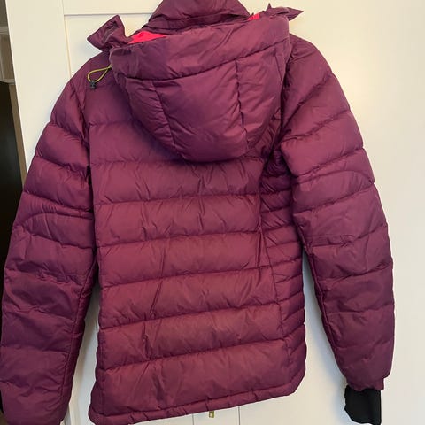 Bergans Down Solid Girl Jkt barn jakke i størrelse 152, rosa farge. Jakken er laget av polyamid (nylon) med Pertex Classic yttermateriale. Den har dunfyll med 550 cuin for isolasjon. Jakken er designet for jenter og har hette og glidelåslommer. Siste bildet viser en lapp på venstre overarm. Mye varm jakke igjen.