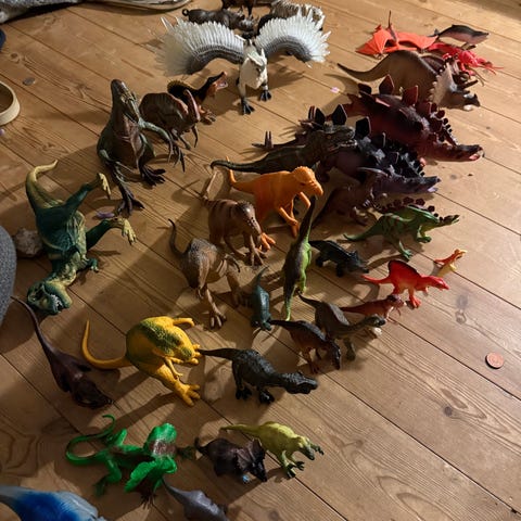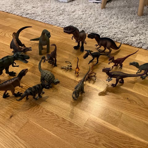 Samling av plastfigurer som inkluderer dinosaurer og ulike dyr. Figurene varierer i størrelse og farge, og kan brukes til lek eller samling.