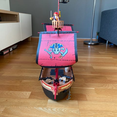 Playmobil piratskip lekesett inkludert flere figurer og tilbehør. Lekesettet består av et stort piratskip med seil, kanon, og detaljer som en rød sklie og utkikkspost. Figurenes størrelse og antall varierer, og de er designet for lek og samling.