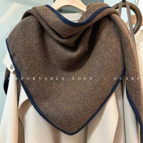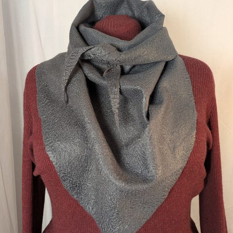 Trekantskjerf: vekt 70 gr, str 150 x 48cm laget av merinoull, dekorert med viskose.