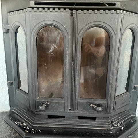 Vedovn i hvit og svart keramikk med glassdør for innsyn til flammene. Passer til oppvarming av rom og gir varmeeffekt. Materiale: keramikk og metall. Selges for 500kr