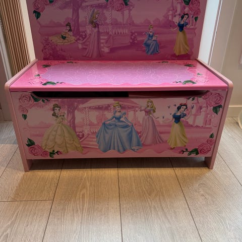 Fin oppbevaringskasse til leker, kan også brukes til å sitte på.
