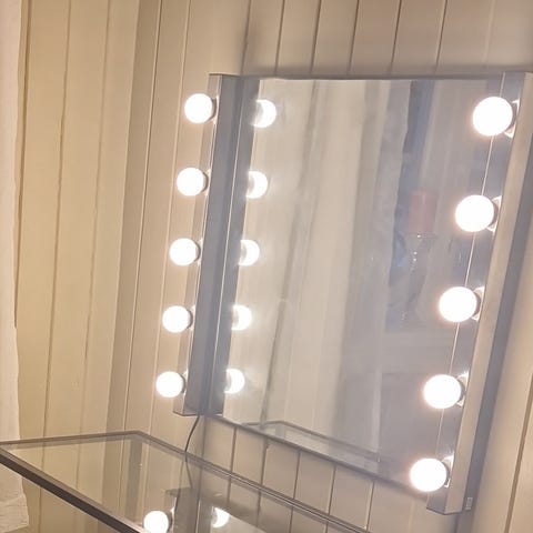 speil med integrerte lyspærer langs sidene. Passer for bruk i baderom eller sminkerom. Gir jevn belysning for bedre synlighet ved bruk. Følger med pærer, ny koster 399kr