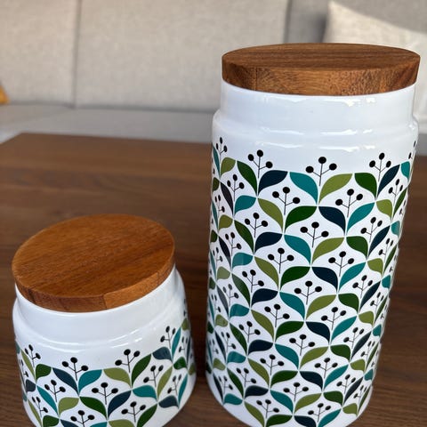 Sagaform oppbevaringskrukker med dekorativt fiskemotiv. Krukkene er laget i keramikk og ha lokk av tre. Passer fint til f.eks. silderetter. Krukkene har knapt vært brukt og er i fin stand.