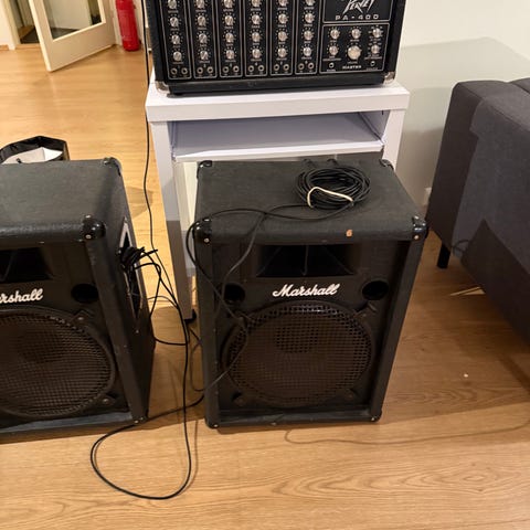 Marshall forsterker og høyttalere i forskjellige størrelser og modeller. Produktene inkluderer både små og store høyttalere samt forsterkere med ulike kontroller og tilkoblinger. Egnet for lydforsterkning i ulike sammenhenger.