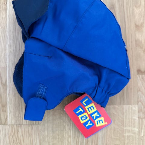 ABC Design barneklær til vinter består av flere plagg i blått og hvitt, inkludert luer med dusk og votter. Materialene er varierende, egnet for kalde værforhold.