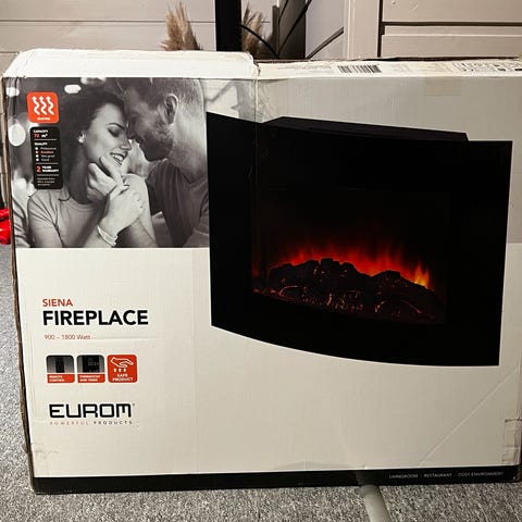 Elektrisk peis med veggmontering i rustfritt stål med dekorative steiner selges.