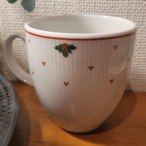 Et litt mindre, lett krus med vakker håndmalt stil og dompapp sittende på einer og bær. Varmt, nostalgisk motiv – perfekt til julegløgg eller kaffe.