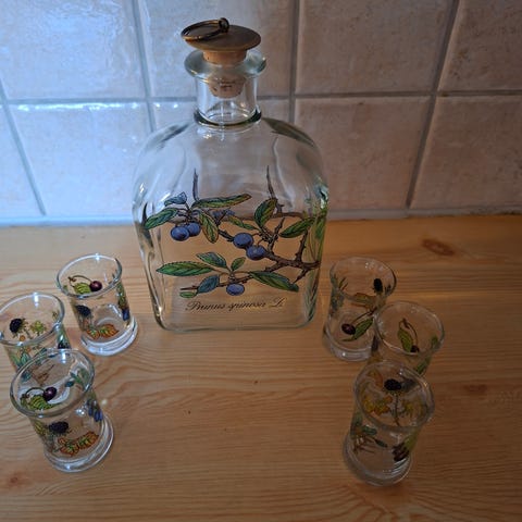 Holmegaard glasskaraffel laget av klart glass. Karaffelen har en bred bunn og smal hals, egnet for servering av vin eller andre drikker.