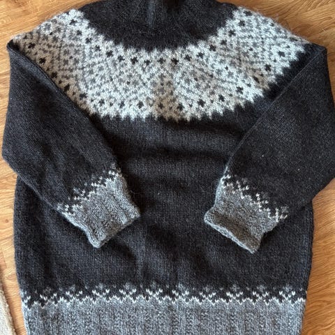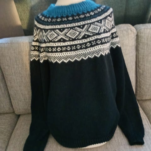 Hjemmestrikket mariusgenser i super kvalitet til unggdom/ ung voksen. Koksgrå med hvit og blå detaljer.