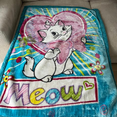 Rosa Pledd / teppe og 2 siklesmekker med kattemotiv og hjerter.