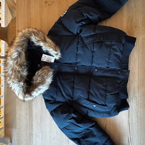 Superdry Mountain jakke i størrelse XL for dame. Jakken er grå og laget av polyester. Den har hette og glidelås, samt kombinerte materialer på ermer og kropp for funksjon og komfort.