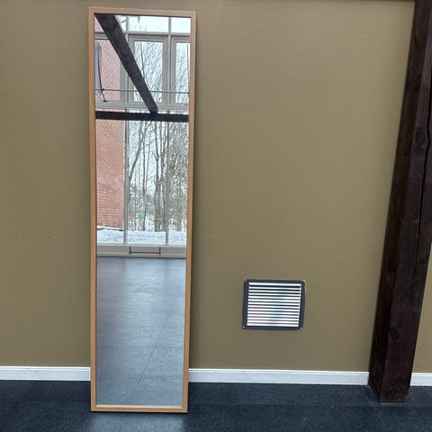 Tungt og solid speil med genialt oppheng som er veldig lett å montere.