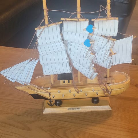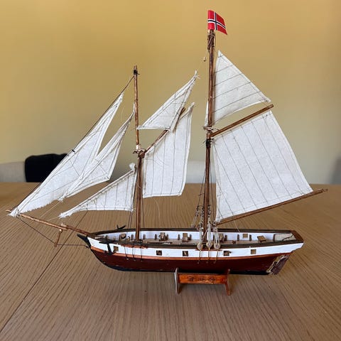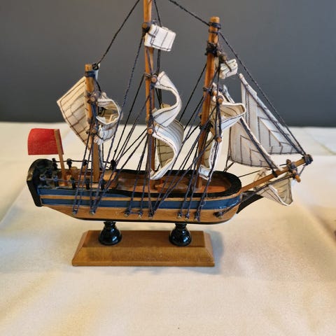Modellbåten er laget i tre med hvit og rød farge. Passer som maritim dekorasjon eller samlerobjekt.