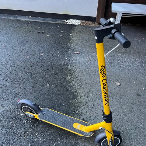 Classywalk elektrisk sparkesykkel med LED-lys, brems og ståbrett. Sparkesykkelen har et svart design med brune håndtak og er utstyrt med lys under ståbrettet for økt synlighet. Egnet for transport og pendling. Eneste problemet er at en ikke gir gass. Har inne hatt tiden til å fikse det