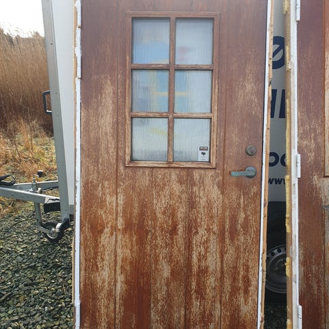 Har vært skrudd fast og tatt hele av. Impregnert materiale grunnet med visir og malt frostrøyk hvit farge. Må skrapes litt og males før bruk.