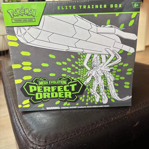 Pokémon Mega Evolution Elite Trainer Box inneholder samlekort og tilbehør for Pokémon-kortspill. Esken har et design med Mega Evolution-tema og inneholder kort, terninger, kortbeskyttere og spillematte for spillere.