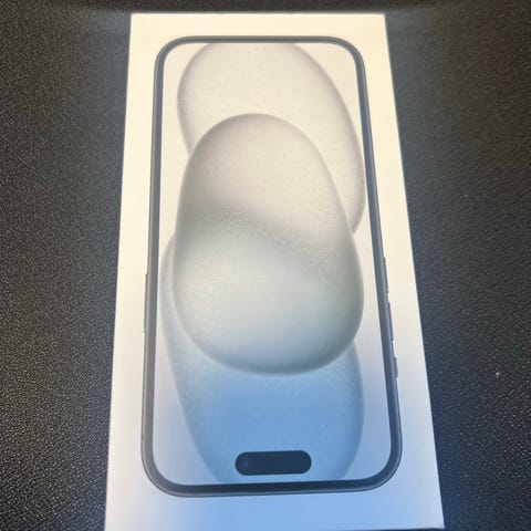 Apple iPhone 15 mobiltelefon med 128 GB lagringskapasitet i svart farge. Telefonen har en skjerm med høy oppløsning og et kamera på baksiden. Batteritilstanden er 100 %, og telefonen er produsert i 2024 med kjøpsdato i september 2024.